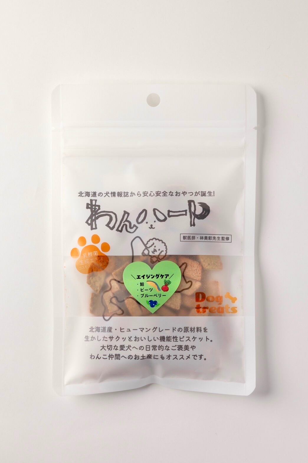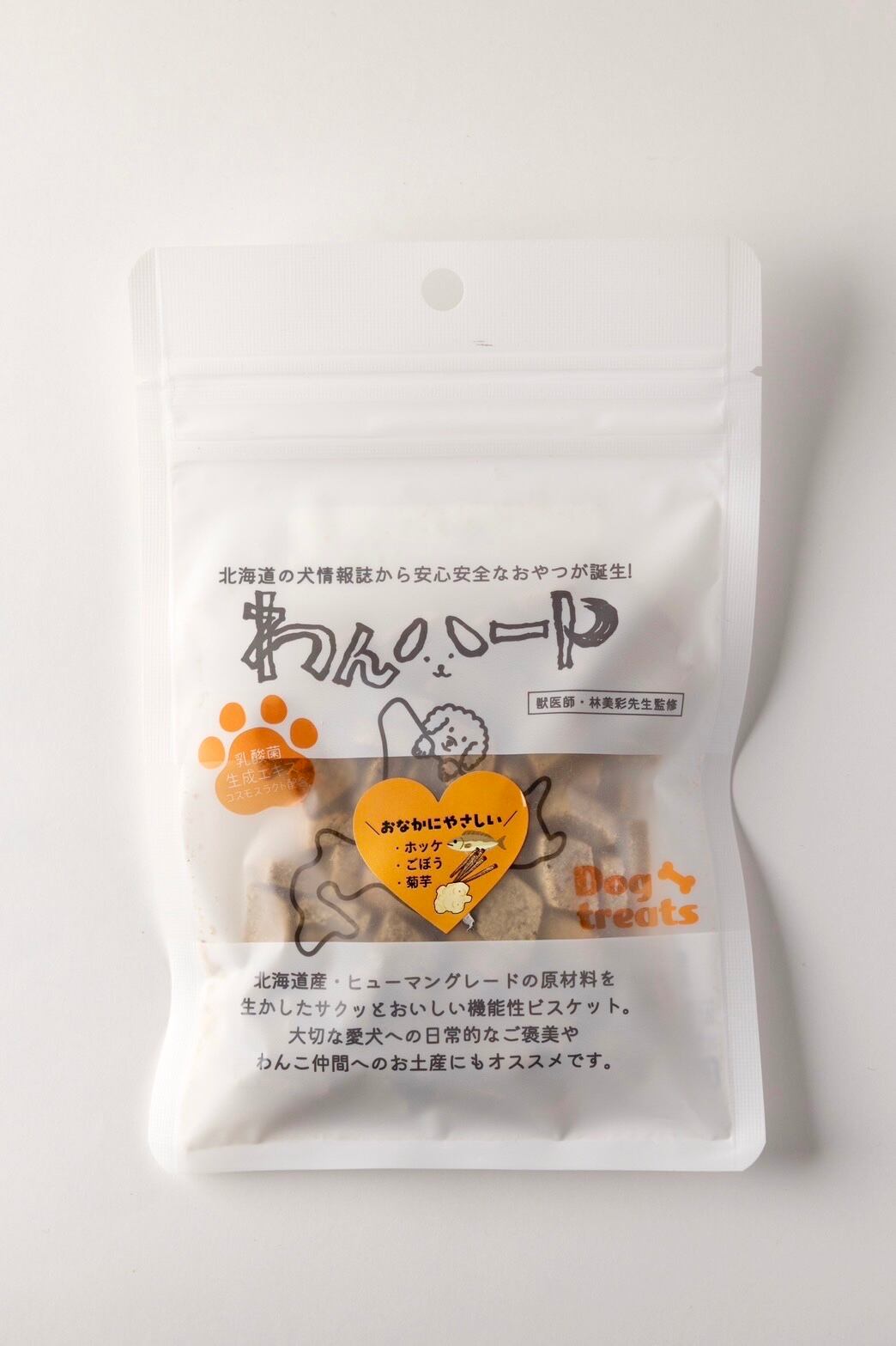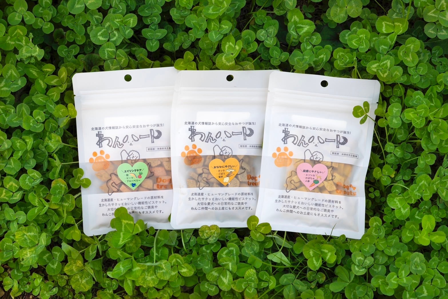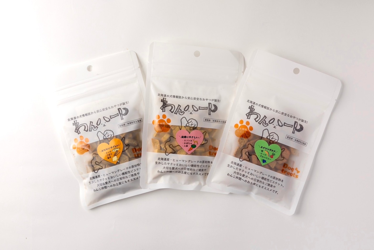 「長生き犬ごはん」などでも知られる鷹栖の獣医師・林美彩先生監修のもと「おなかにやさしい」「皮膚にやさしい」「エイジングケア」をサポートする食材を用いて、3種類のビスケットを用意しました。北海道産の原材料に、乳酸菌生成エキス「コスモスラクト」を配合しています。ほど良い硬さで、小さなわんこも割って食べられます。